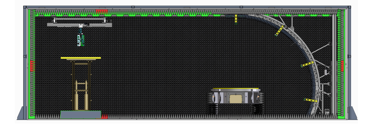 This chamber has the reflector installed on the top, system performs the spherical scanning with the swing arm. DUT can be easily laid flat on a one–dimensional azimuth positioner. Moreover, unlike planar near–field testing that requires precise positioning of the DUT, this approach significantly reduces the pre-test setup time and simplifies the testing procedure.